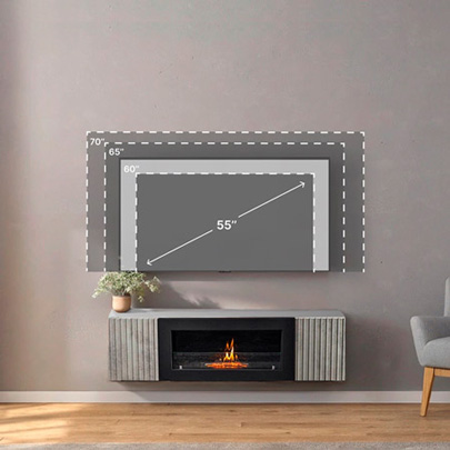 При разработке модели были выбраны универсальные габариты, которые будут гармонично выглядеть в помещениях разного размера. Также на схеме вы можете проверить сочетание своего телевизора и размеров модели.