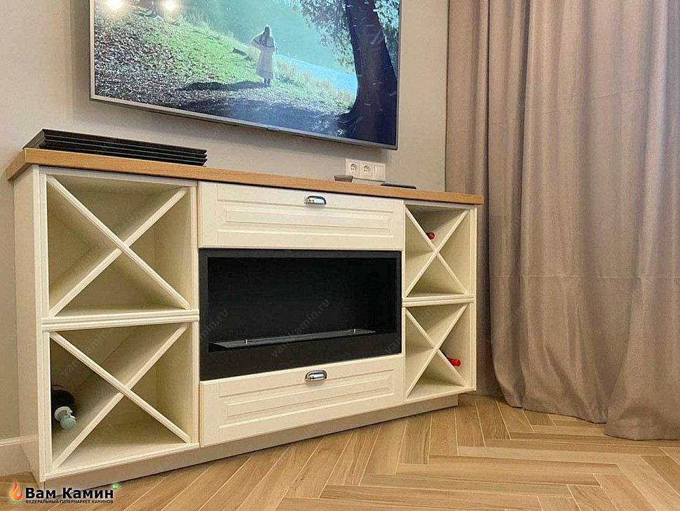 Одно из основных преимуществ биокаминов - компактные размеры дают возможность устанавливать их в стены, ниши и предметы мебели. В данном случае мы можем видеть экокамин, который встроили в красивую тумбу с винными полками. Тумба традиционно расположена под ТВ-экраном, поэтому можно с комфортом смотреть любимые фильмы в тепле и уюте. Такой биокамин создавался компанией SteelHeat на заказ по размерам клиента.