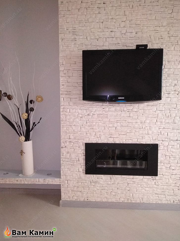 Биокамин в нишу SteelHeat LONG 900 Small XL в колонне стены выглядит аккуратно и изящно. Темный цвет биокамина удачно сочетается с черным цветом телевизора и создает контрастный акцент на бежевом цвете колонны, которая стилизована под каменную кладку. Что особенно хорошо, биокамин находится на безопасном расстоянии от экрана телевизора. В то же время такой экокамин снабжен защитным стеклом, которое подчеркивает его великолепный современный дизайн.