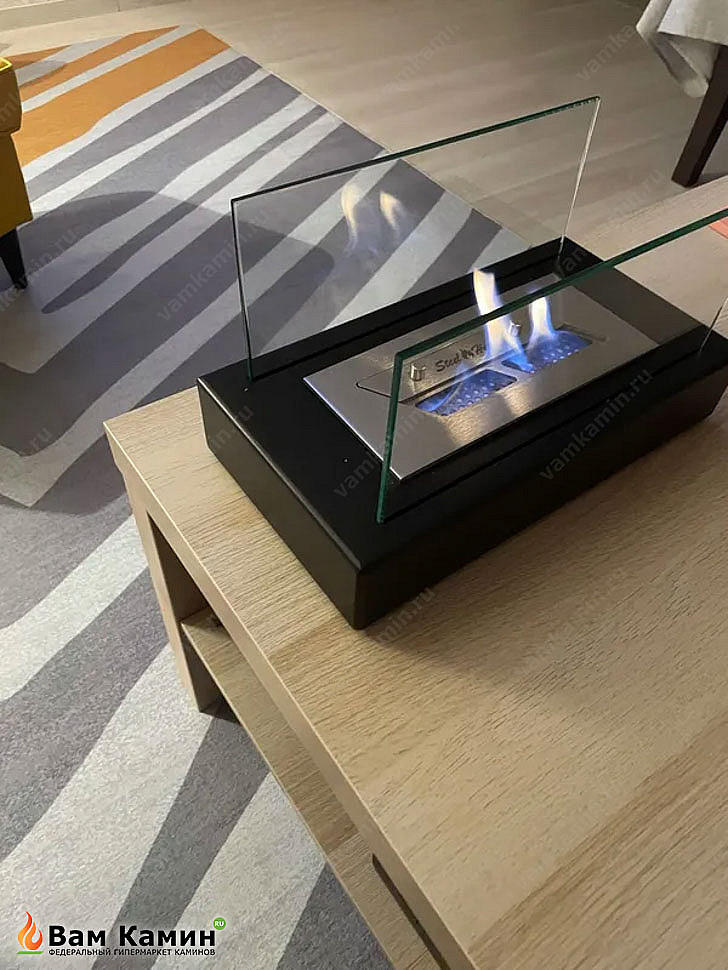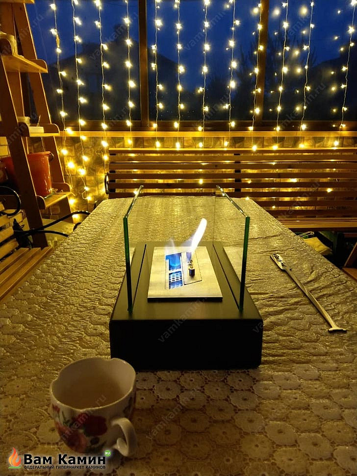 На фото видно, что хозяева по достоинству оценили мобильность и компактность настольного биокамина SteelHeat. Настольный биокамин SteelHeat VERONA черный дает возможность по желанию устанавливать его в разных частях квартиры или брать с собой на дачу. В то же время благодаря его небольшим размерам купить биокамин такого типа можно по сравнительно невысокой цене.