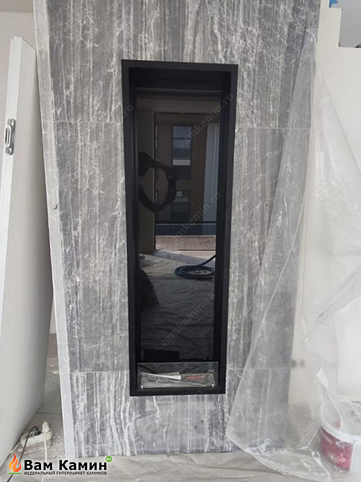 Вертикальный биокамин в нишу такого типа создавался на заказ. Хотя по фото видно, что помещение находится на стадии чернового ремонта, экокамин уже полностью смонтирован. Для монтажа не потребовалась вытяжка или дымоотвод, поскольку биокамин работает на биотопливе. Топливо для биокамина горит без искр, запаха и дыма.